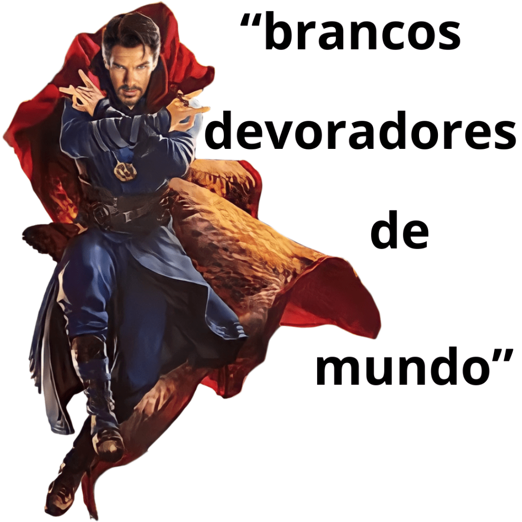 Dormammu, no filme, é um conquistador e devorador de mundos, que habita a dimensão negra, e a Terra é o planeta mais cobiçado por ele. Percebi, tomando como referência as reflexões de Ailton Krenak, que podemos considerar Dormammu, na verdade, como um dos alter egos das sociedades ocidentais. Dormammu, o conquistador e devorador de mundo, não é uma alteridade, ou seja, aquele outro forasteiro, que não faz parte do nosso grupo e quer nos prejudicar, mas é a projeção no outro da imagem feia, obscura e tervosa dos próprios ocidentais: os brancos devoradores de mundo. Podemos projetar essa reflexão e esse embate como uma luta entre aqueles que buscam proteger o planeta e a possibilidade da vida dentro dele e aqueles que tentam destruí-lo e buscam outros mundos para explorar e destruir. Não é curioso que vários países e instituições do ocidente vêm já há alguns anos tentando colonizar outros planetas? Se estamos de acordo, cabe mais uma pergunta: quem é de fato o tal do Dormammu?