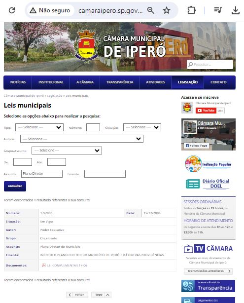 Caso você não tenha sido informado, no dia 27 de maio de 2024, foi realizada, na Câmara Municipal, a 1ª Audiência Pública de Revisão do Plano Diretor de Iperó (PDI), que irá completar 20 anos em 2026. Segundo a Lei Complementar que instituiu o PDI, sua revisão deveria ter sido feita em 2016, pelo prefeito da época, mas, consultando os arquivos da Câmara, não consta nenhuma lei de revisão do plano desde 2006 (ver imagem abaixo).
