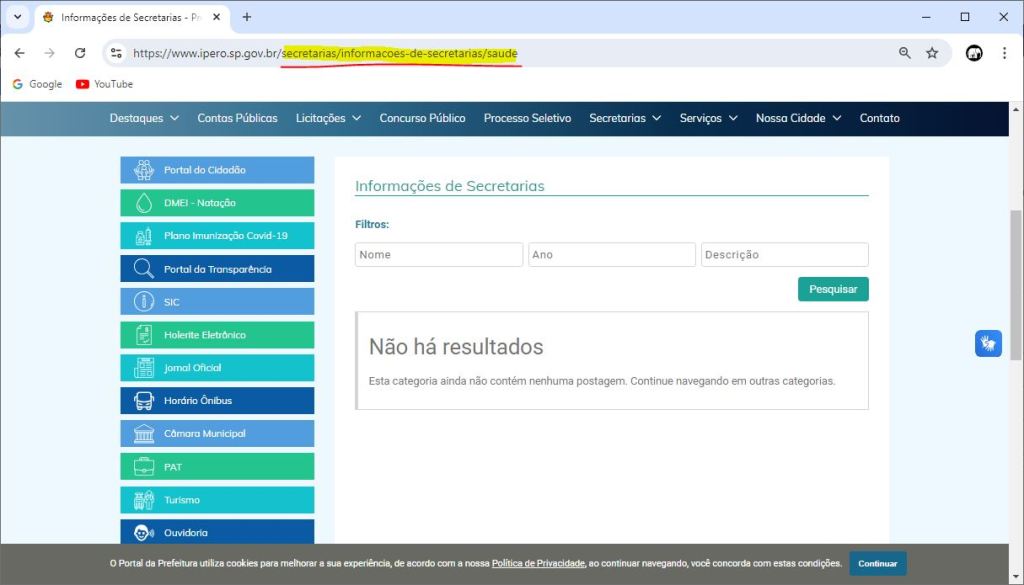 E observamos, naquela ocasião, que o cargo de Secretário da Saúde estava vago e questionamos se ele permaneceria vago até o final do atual mandato, 2024? Pois, verificamos que, apesar de a gestão ter disponibilizado os dados dos Secretários no site da Prefeitura, como dissemos, não há informações sobre o Secretário da Saúde, o que nos leva a crer, por dedução, que o cargo ainda continua vago.