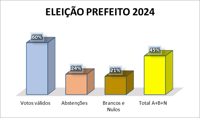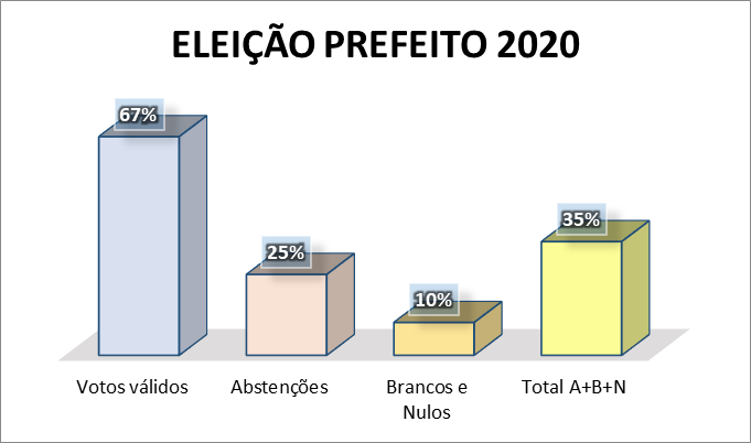 O segundo dado importante a ser observado é a redução do percentual de votos válidos, que caiu de 67%, em relação ao total de eleitores, para 60%, ou seja, o número de votos válidos, que representa os votos depositados para os candidatos a prefeito, no nosso caso, o candidato único, em comparação com o número total de eleitores, que teve um crescimento de quase 5%, ficou 7% menor que na eleição anterior. Isto significa que apesar de o prefeito eleito ter aumentado seu número total de votos de 8.051 para 12.964, ele teve menos votos proporcionalmente ao número de eleitores que na eleição passada. Isso, por si só, indica que ele perdeu votos.